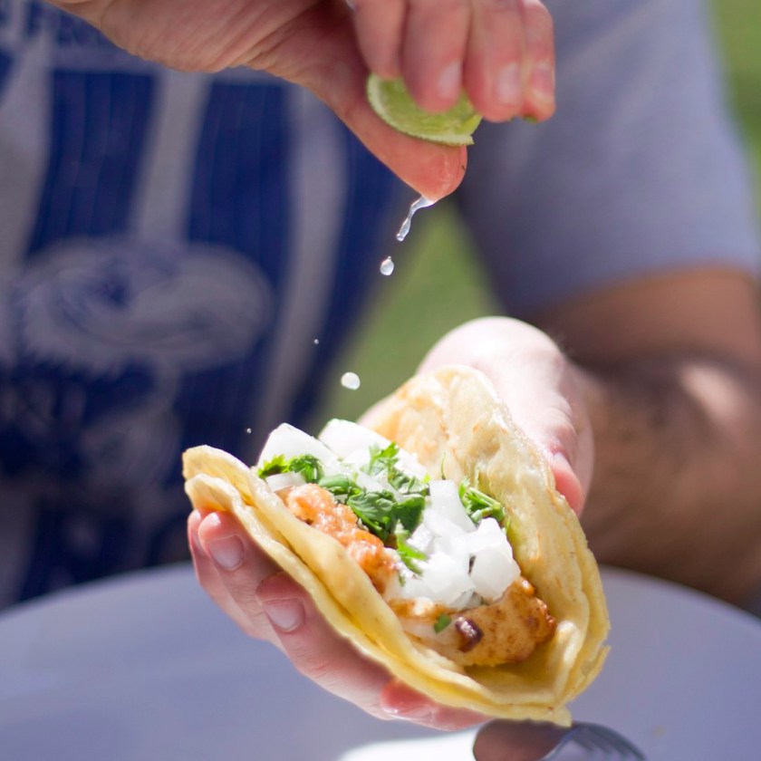 Fish tacos are one of our favorite casual & fun meals to do at home. If you have the basic fixings: onion, cilantro, good tortillas, and lime then they will be delicious. For goodness sake don’t forget the lime. You can always add a creamy slaw or guacamole, but for this laid back day we kept it simple.